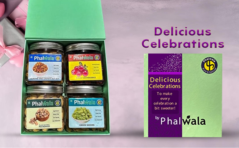 This Smart high quality box is our best selling gift idea . It contains Four- 200gm Jars each of Roasted Almond+Cashew Mix , Green Raisins , Dried Cranberries and Roasted Salted Pistachios , and is a packed with shrink film to shine as an attractive present. Its easy to transport and can be customised according to the occasion as a gift. There are many variations you can find online as well as find gift boxes of 4 jars as well as 6 jars. This mix of Salted Roasted Cashews , Almonds , Pistachios with the sweet falours of Green Raisins and a unique sweet and sour taste of Dried Cranberries is a great sweet and savoury combination.